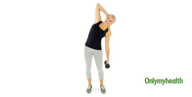 For this exercise grab a dumbbell in each hand. Stand straight with your feet apart. Raise your right hand upwards and now bend your waist towards left as low as you can. This will stretch your muscles from the sides. Now straighten up and relax for few seconds and repeat the same for the right side. Repeat this ten times for each side.