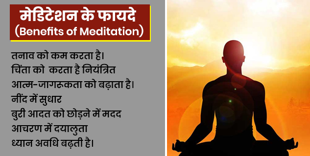 मेडिटेशन करने से स्ट्रेस कम होता है। स्ट्रेस होने से इम्यूनिटी कमजोर होती है। जिसकी वजह से आपको तमाम समस्याएं हो सकती हैं। जैसे- मेटाबॉलिज्म पर असर, पाचन पर असर, फ्लू और वायरस फैलने का खतरा इत्यादि। इसलिए नियमित रूप से मेडिटेशन करें। मेडिटेशन करने से मन को शांति मिलती है, जिससे स्ट्रेस कम होता है।