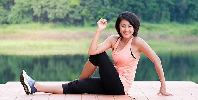 The reclining twist stretches the whole spine. Lie on your back, knees bent and feet on the floor near the pelvis. The arms are extended from the shoulders, palms down. Cross the right thigh over the left, wrapping the legs tightly (if possible, catch the left shin with the toes of the right foot). Now lift the pelvis off the floor momentarily, sliding the left hip underneath and toward the center. Then lower the pelvis, twist to the left, and let the wrapped legs release toward the floor.