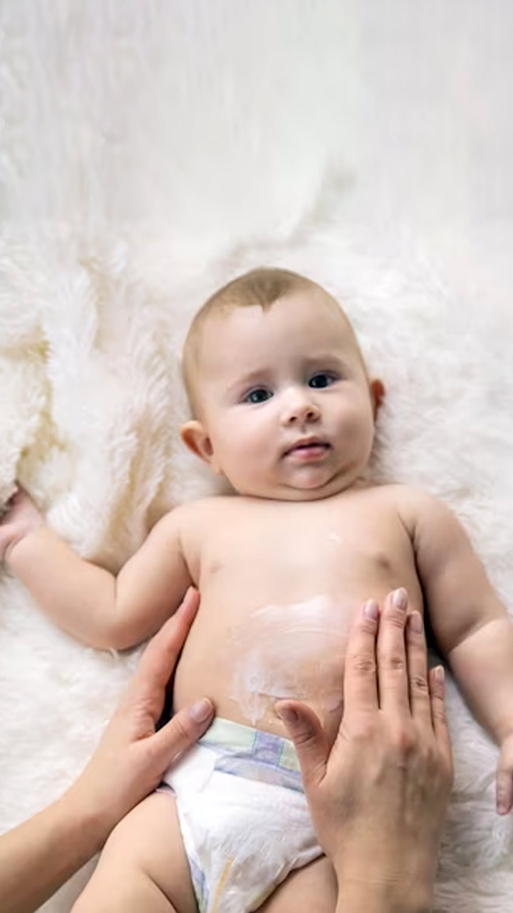 If your baby has not burped after eating food, it may cause their stomach to hurt. Massage and rub the baby's back for relief.