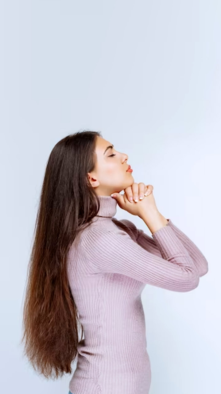 Stroke downwards from the nape of the neck with your fingers. At the same time, lean your head back and bend your neck to connect your chin to your chest. Repeat the procedure twice.