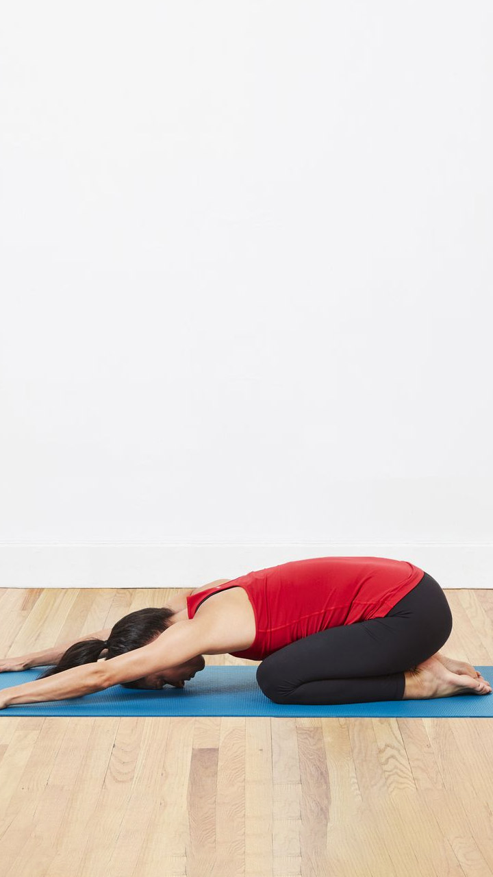 Child pose can help you to get rid of a stiff back by stretching your back and muscles around the hip area.