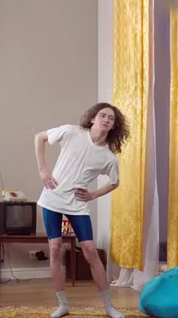 Hip circles are an exercise to loosen the muscles of your lower back. Place your hands around your hips and move them in a circular motion.
