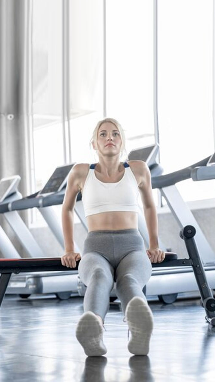 Place your palms on the border of a bench as you sit with your shoulders forward. Straighten your limbs, lower your torso towards the floor, and slide your butt off the edge. Push yourself back up to where you were before and repeat.