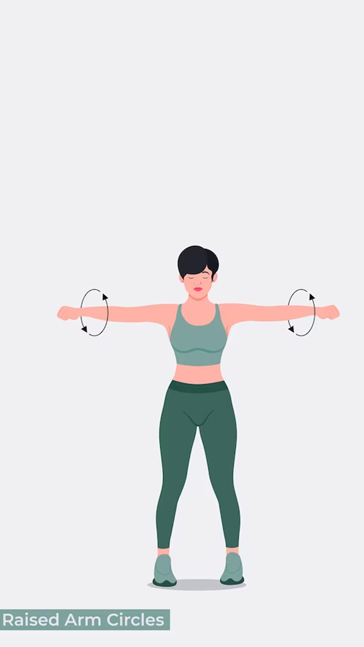 Hold your arms out to the sides at shoulder height while standing with your ankles shoulder-width apart. Make small circles with your limbs and then enlarge them over time.