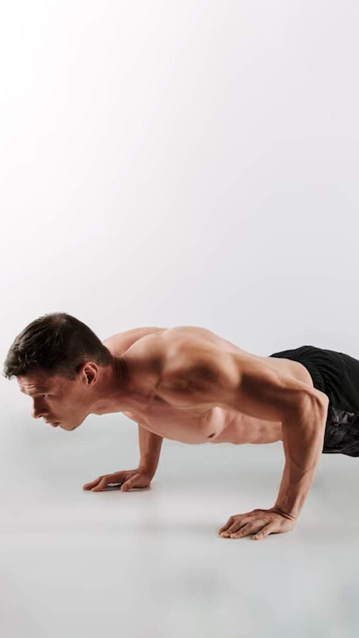 Start with your palms shoulder-width apart in a plank posture. Now lower your body by bending your arms, keeping your elbows close to your sides. Push yourself up to the beginning position and repeat.