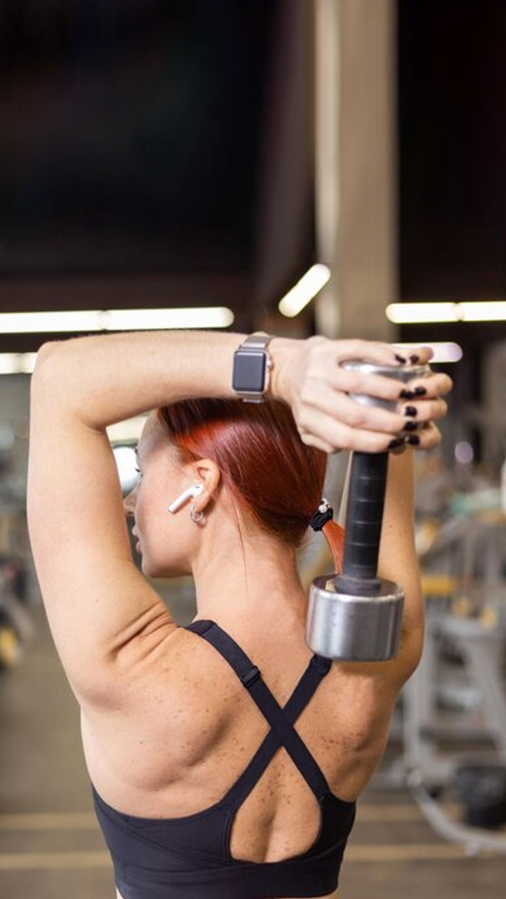 Holding a dumbbell, take a shoulder-width position. Raise the dumbbell above your head with your arms straight. Bend your elbows, lower the dumbbell behind your head, and straighten your arms to lift the dumbbell back up.