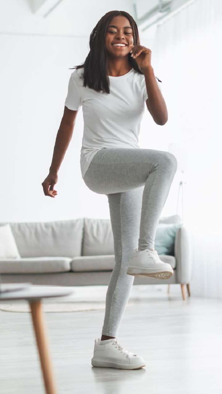 High knee run is a great alternative to running outside. It not only gets rid of excess fat on your legs but also flattens your tummy.