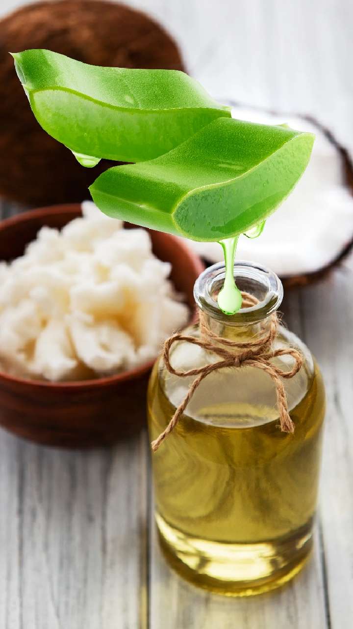 Mix aloe vera gel with an equivalent amount of coconut oil in a bowl as a base for the hair tonic.