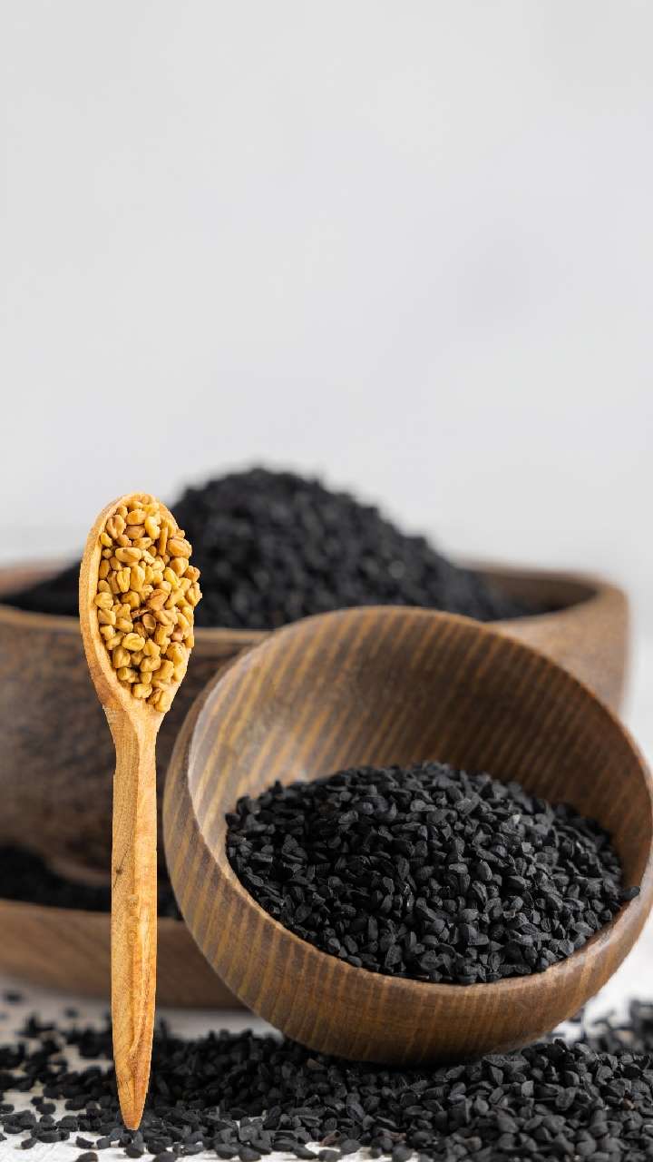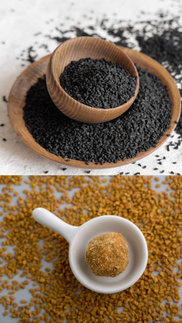 Black seed (Kalonji) and fenugreek (Methi) are rich in nutrients that promote hair health.