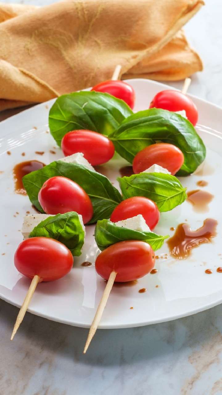 Thread cherry tomatoes, fresh mozzarella balls, and basil leaves onto skewers. You can enjoy this snack in the evenings.