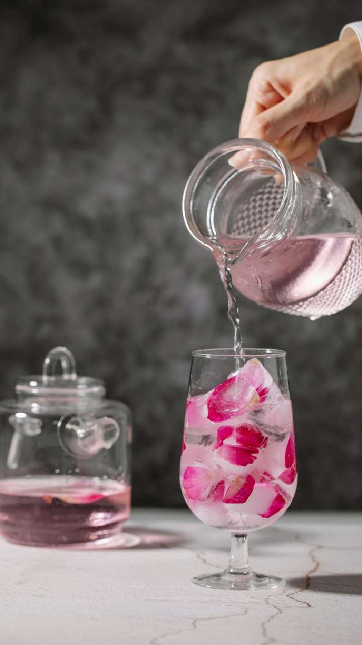 To make rose petal-infused water add fresh rose petals to the water. You can also add sugar syrup to enhance the taste.
