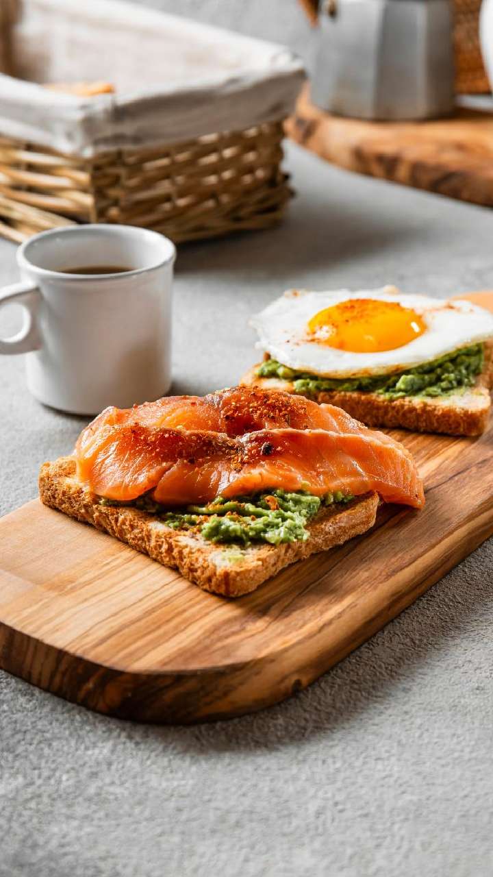 A sandwich with crispy tofu, a fried egg, sliced avocado and mayo on toasted bread. It can be a nutrition-rich breakfast.