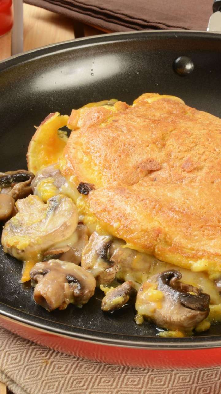 Scrambled eggs with sautéed mushrooms and Swiss cheese melt over a healthy muffin.