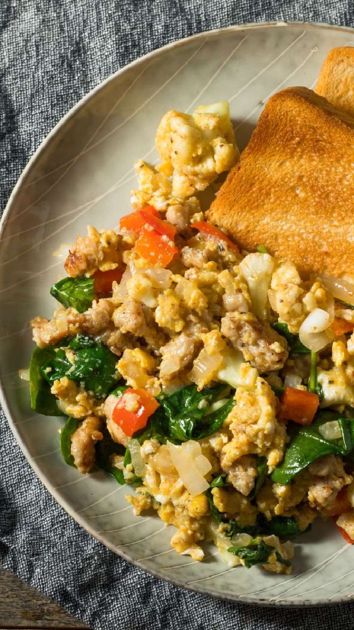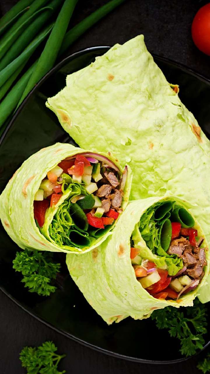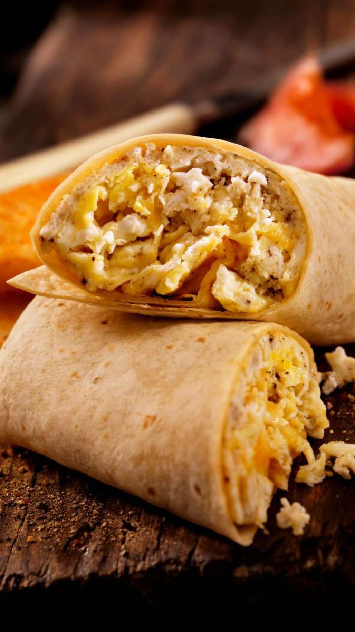 A tortilla wrap of scrambled eggs with sautéed spinach, tomatoes, and feta cheese.