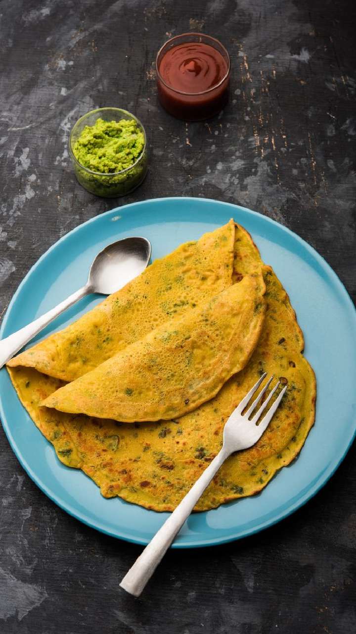 Create a savoury pancake with moong dal (split green gram) and finely chopped vegetables and spices of your choice.