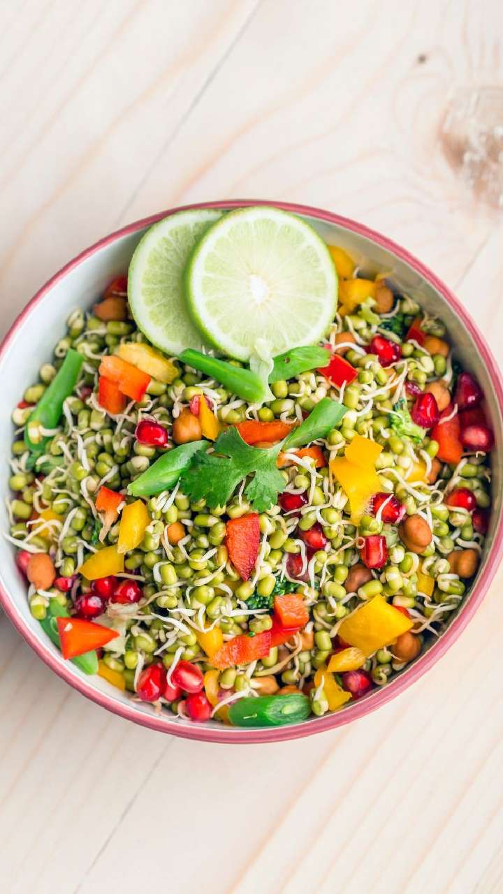 Moong sprouts diced with the rest of the chopped cucumbers, tomatoes and a little bit of chaat masala create an enjoyable salad.