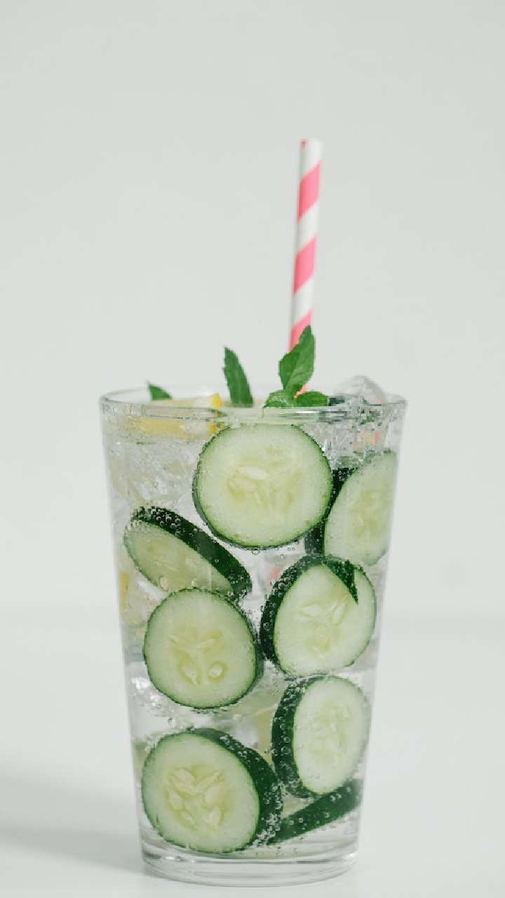 Hydrating and refreshing, cucumber and mint-infused water reduces puffiness, aids digestion, and supports clear, rejuvenated skin.