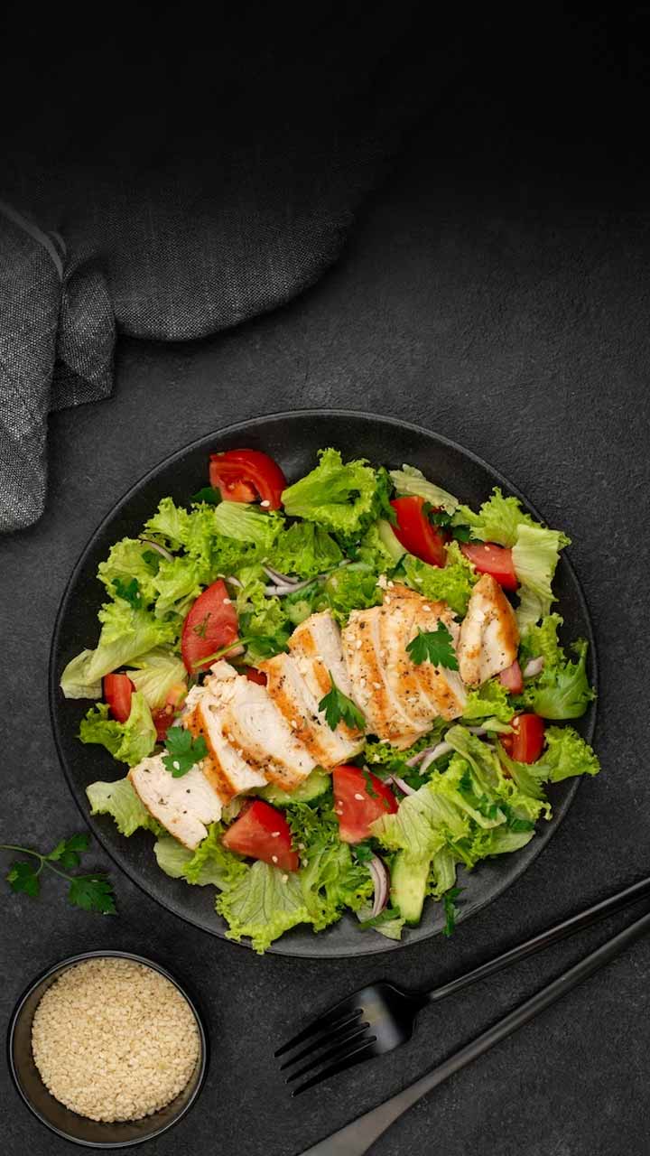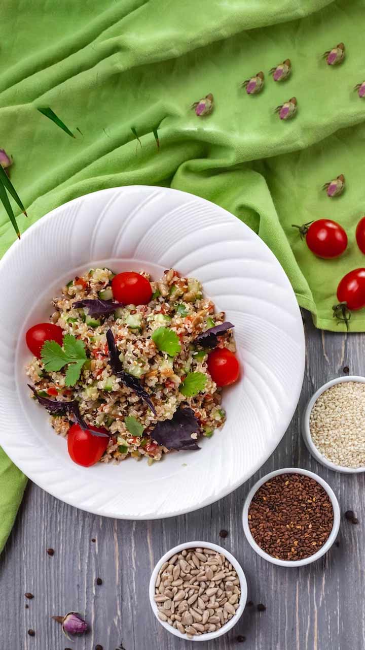 A quinoa salad with fresh veggies, avocado, and a light dressing is a filling and nutritious meal high in protein, fibre, and healthy fats.