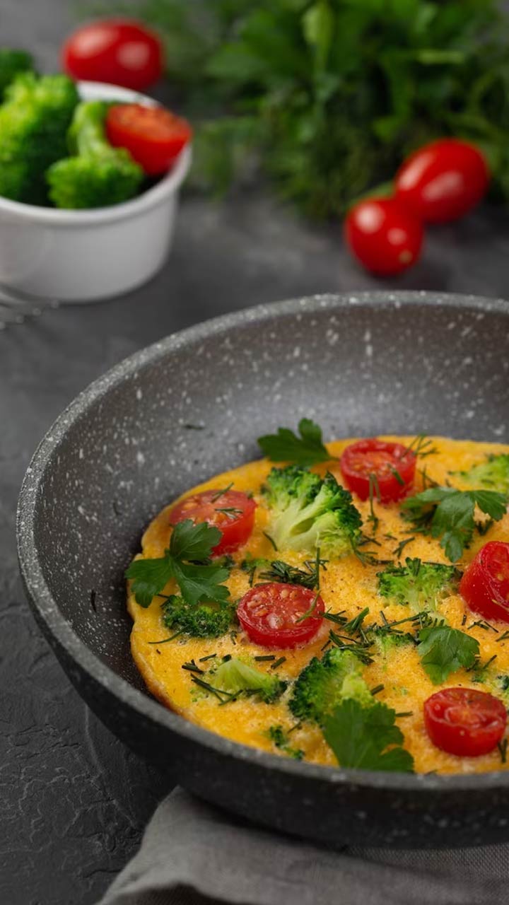 A vegetable omelette made with egg whites and stuffed with fresh vegetables is a low-calorie, high-protein breakfast or brunch meal.