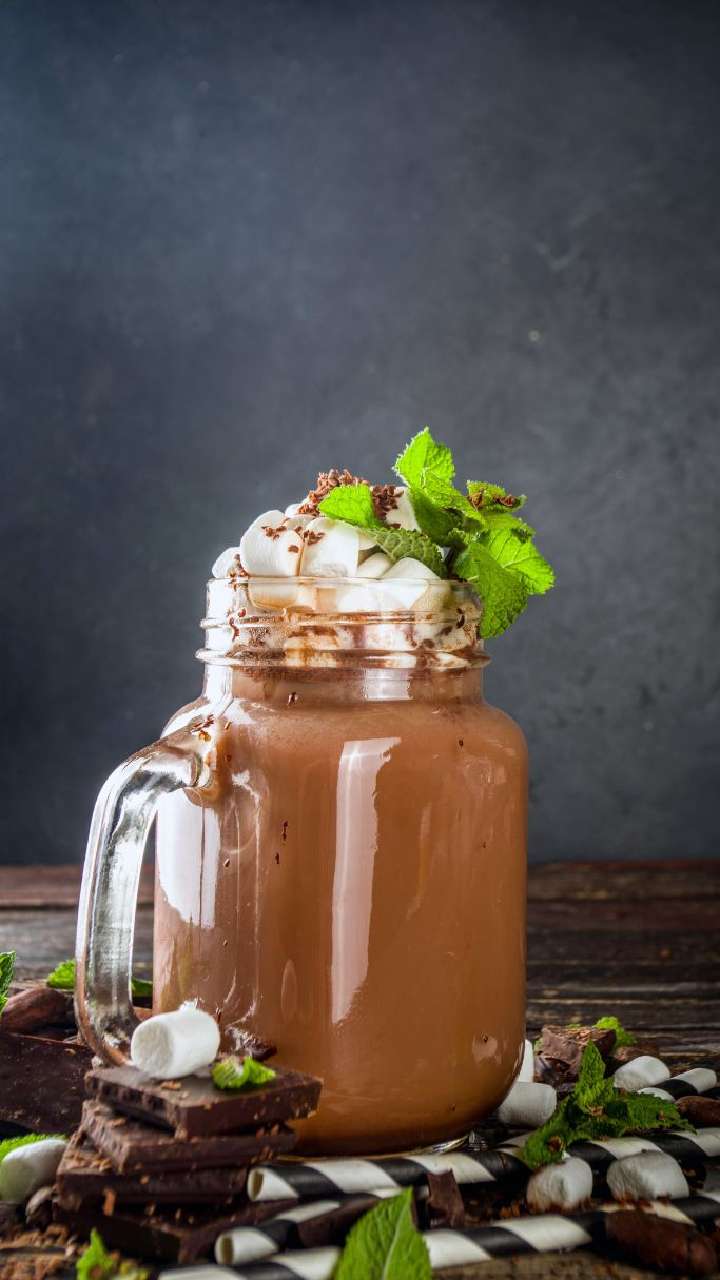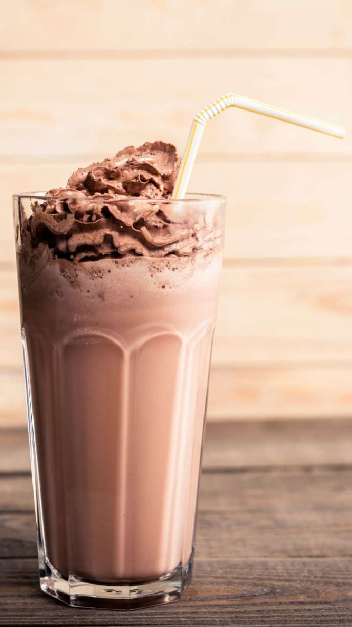 Brewed coffee, chocolate protein powder, and almond milk. Add a scoop of oats for an energy-rich shake.