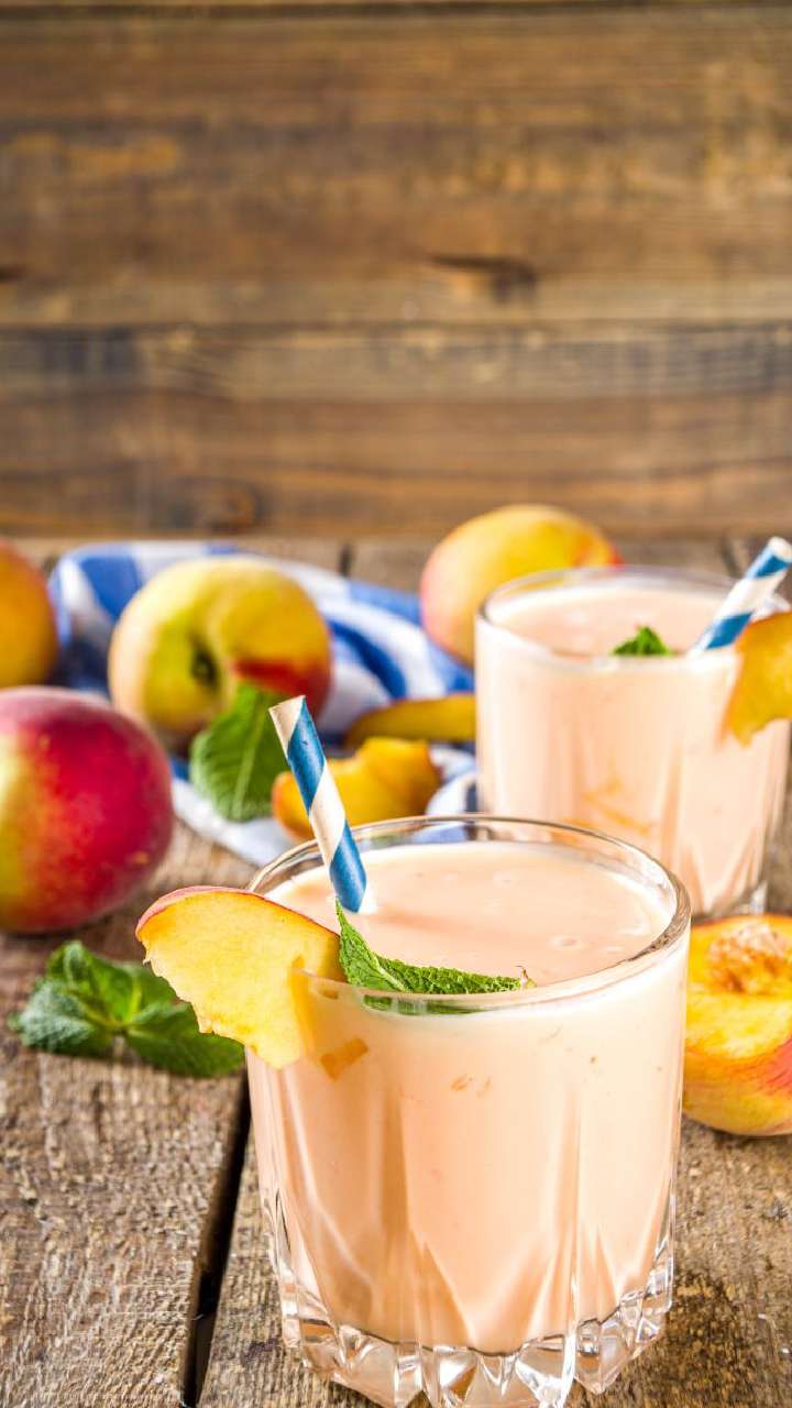 A shake for muscle growth: blend peaches, vanilla protein powder, Greek yoghurt and milk.
