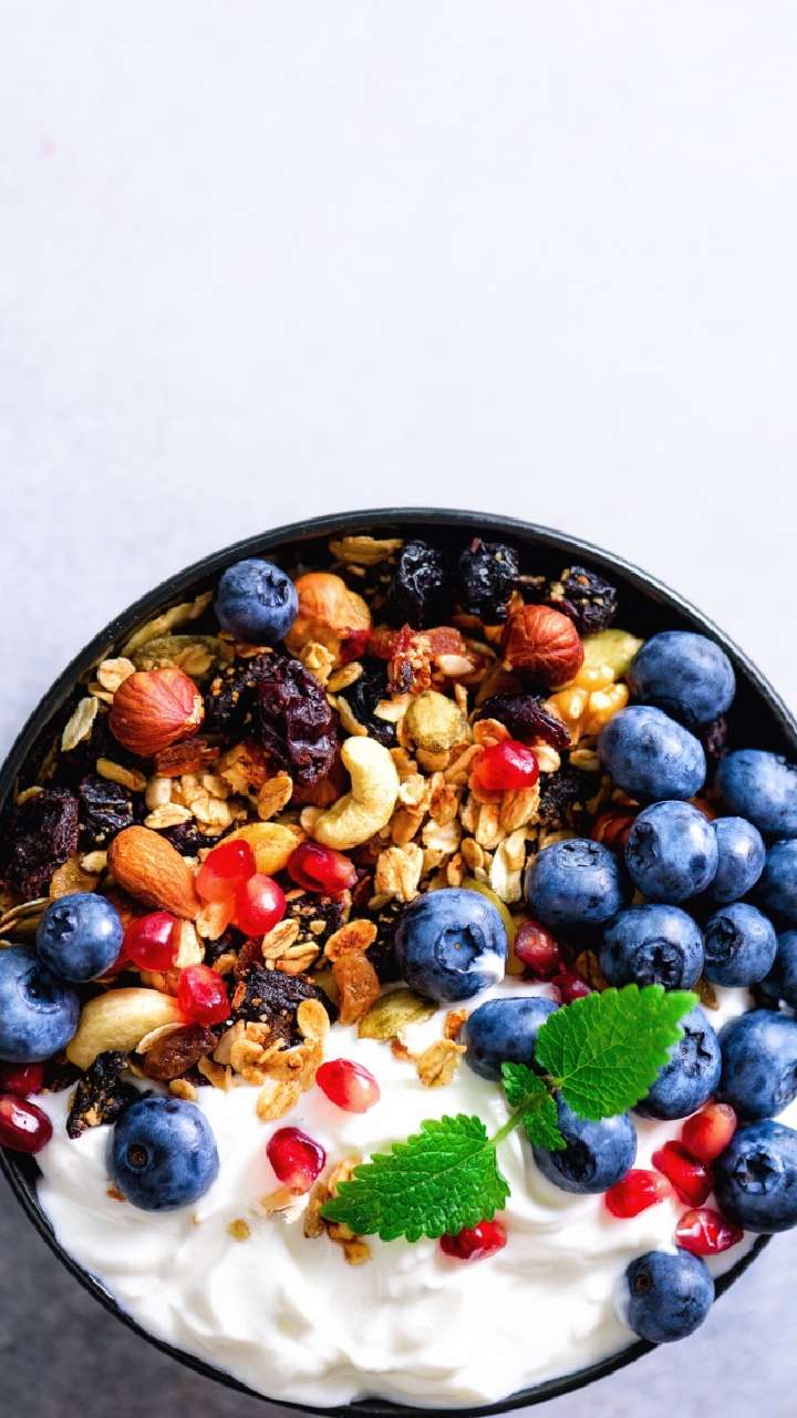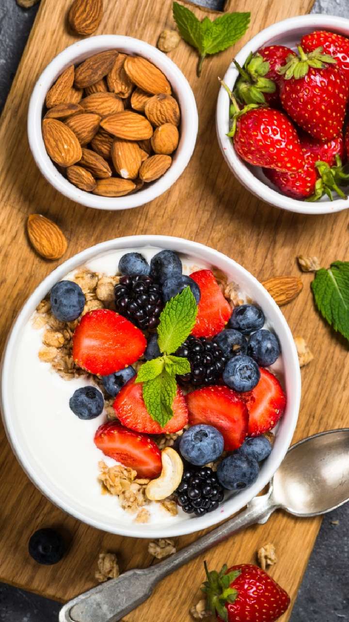 Greek-style yoghurt is a low-fat food high in protein that can be enjoyed with fresh berries for breakfast.