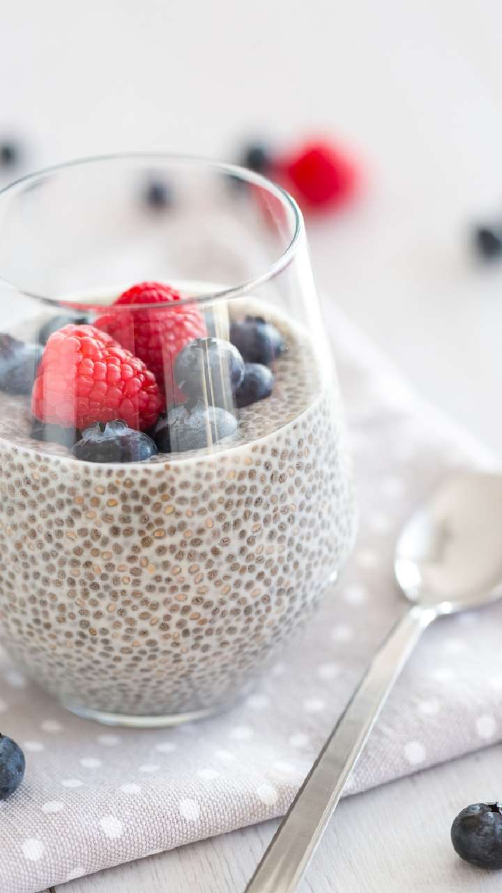 Soak chia seeds in almond milk and leave overnight. Sprinkle with berries in the morning for a low-calorie, high-fibre dish.