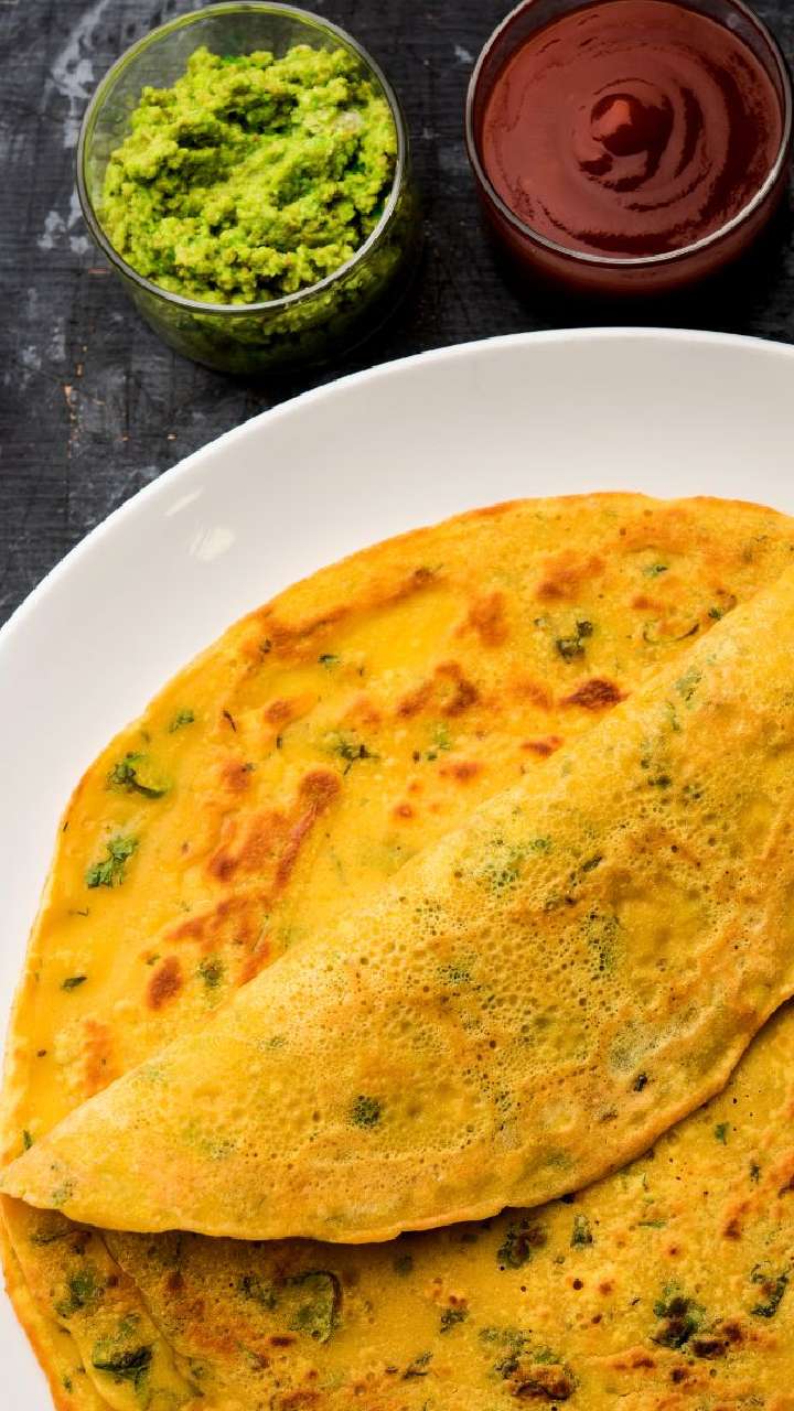 Besan is flour made with chickpeas which are an ideal source of protein. You can start your day with besan chilla and coriander chutney.