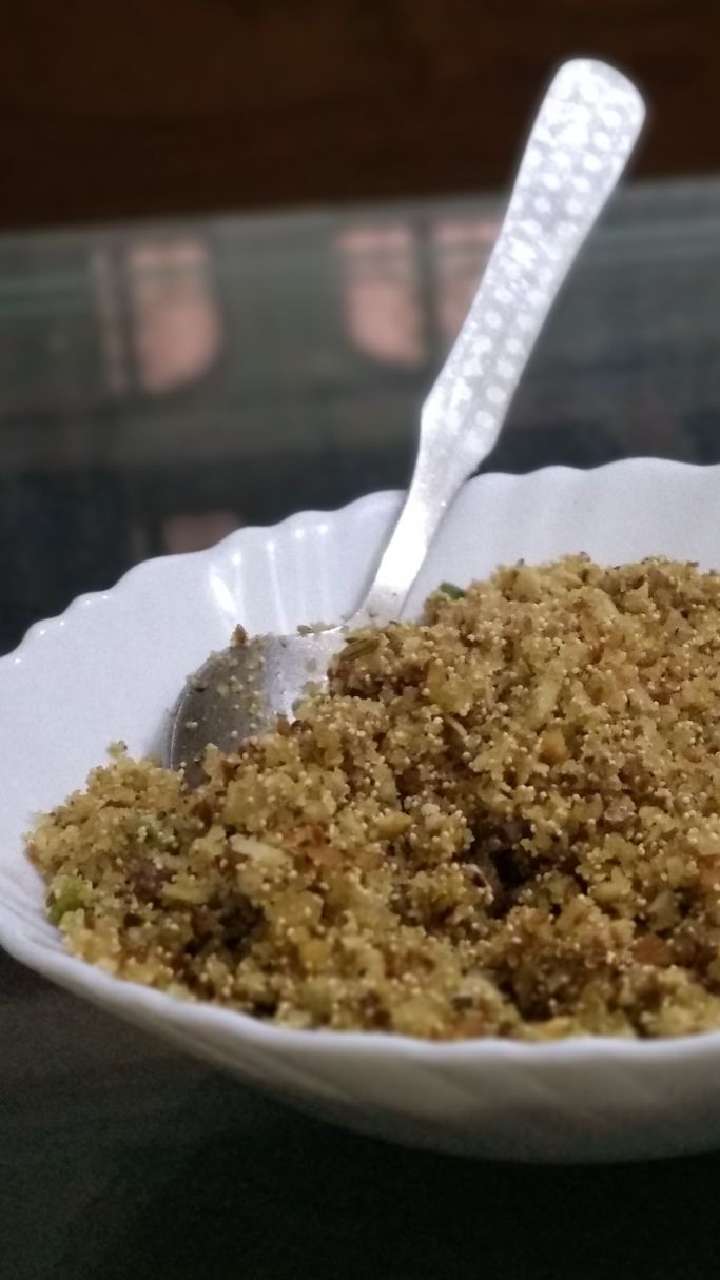 Now, take a mixing bowl and add roasted dhaniya powder, dry fruits, makhana, powdered sugar, raisin, and cardamom powder. Mix them well. Your homemade dhaniya panjiri for bhog is ready.