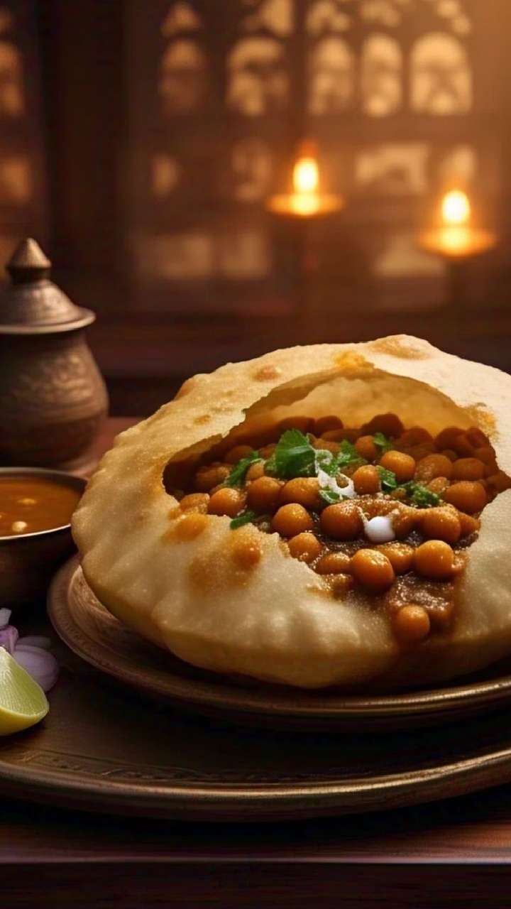 This is a mouthwatering chickpea with deep-fried fluffy bread, called bhature. A famous North Indian dish, comforting enough for breakfast and brunch.