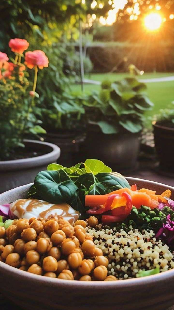 A bright nutrient-rich bowl of chickpeas, roasted veggies, quinoa, and tahini dressing, providing a balanced trendy meal.