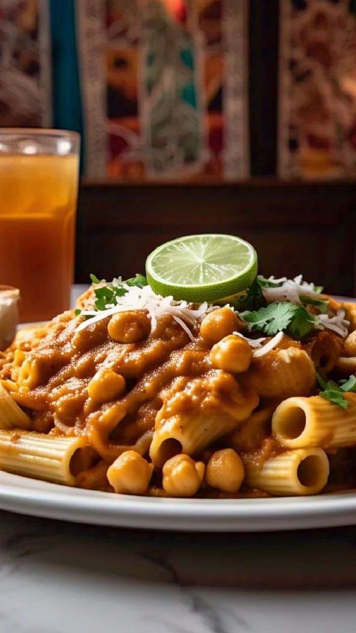 A combination of chickpeas and whole wheat pasta tossed in spicy Indian-style tomato sauce is a cool dish.