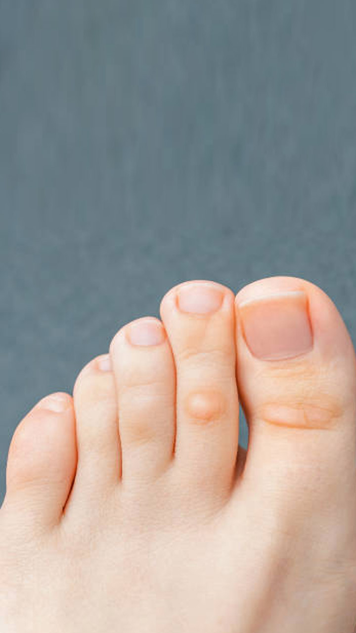 Corns are often round and painful. When exposed to moisture from sweat, they may become soft. Generally, these appear between the fourth and fifth toes.