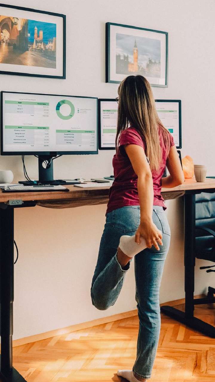 Switch to a standing desk periodically to reduce prolonged sitting and engage different muscle groups. Alternate between sitting and standing to promote movement and reduce strain.