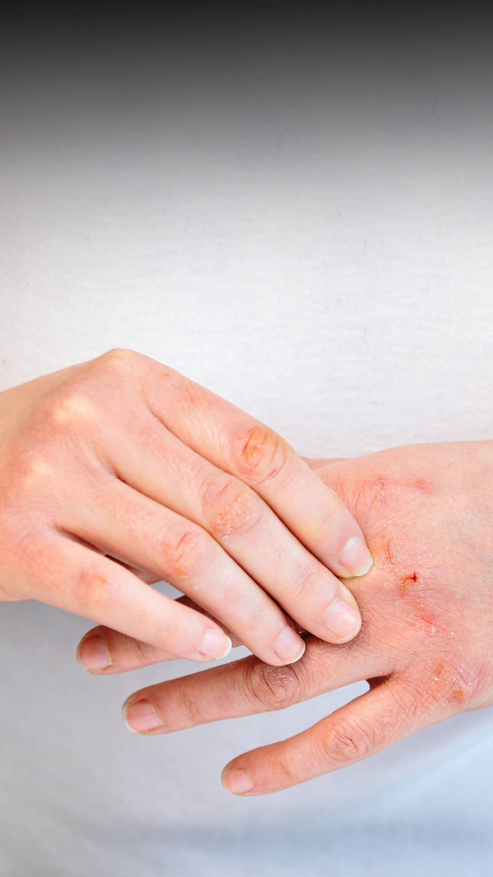 In this skin condition, tiny blisters are formed on the palm and fingers. Often filled with fluids, these blisters can cause itchiness.