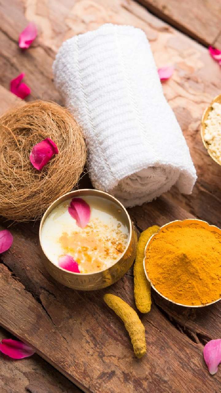 Use turmeric powder and sesame oil to make a thick paste. You can also grind sesame seeds with turmeric to make this Ubtan.