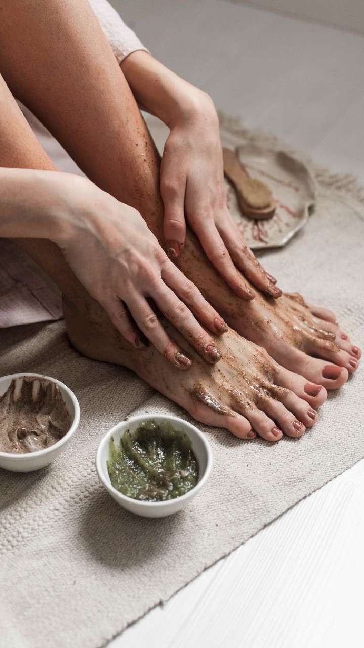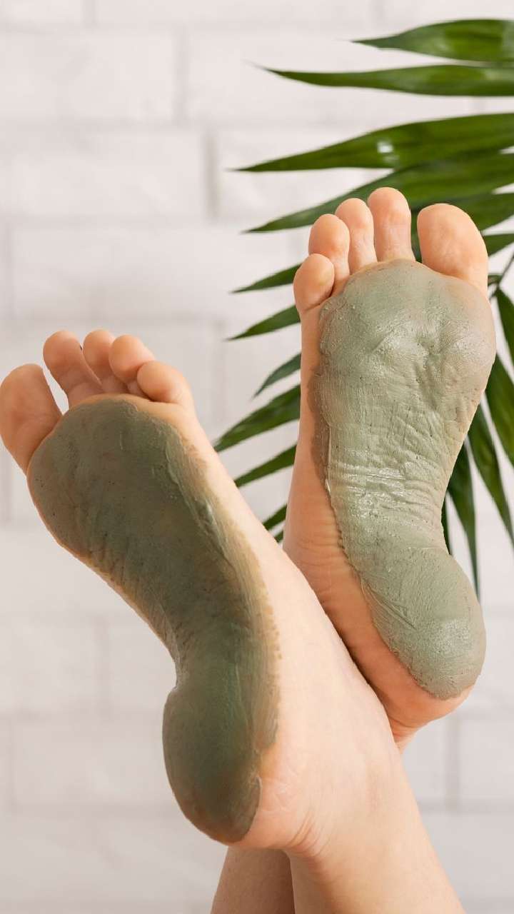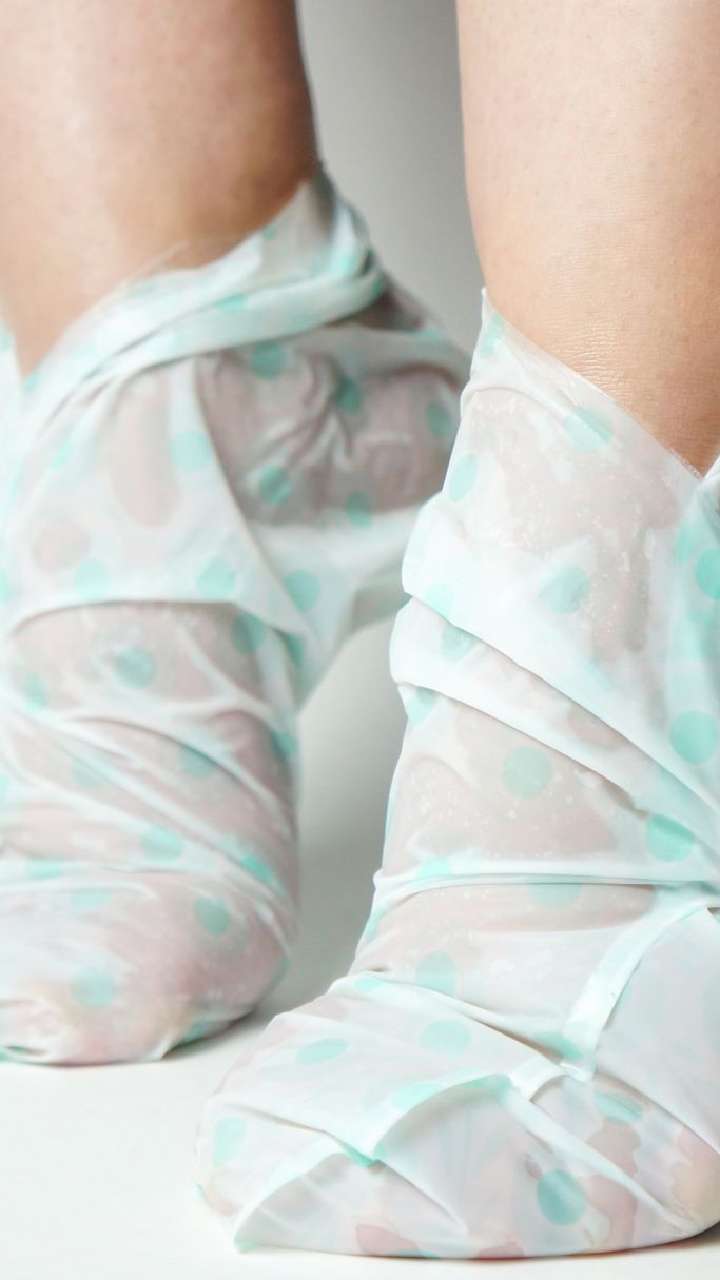After scrubbing and moisturising, apply a thick layer of foot mask and wrap your foot in a wrap or warp towel. It can help to nourish your feet.