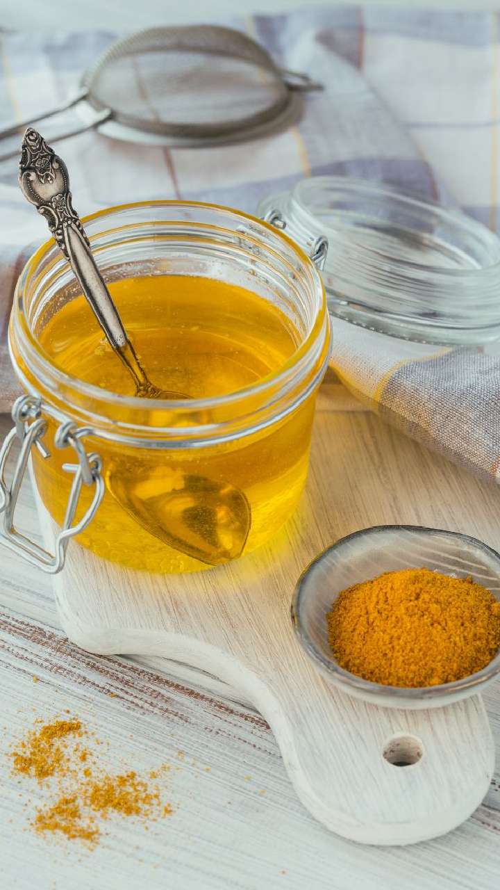To make a magic potion, mix turmeric powder with ghee. Add honey for a better hydration effect. Stir until smooth.