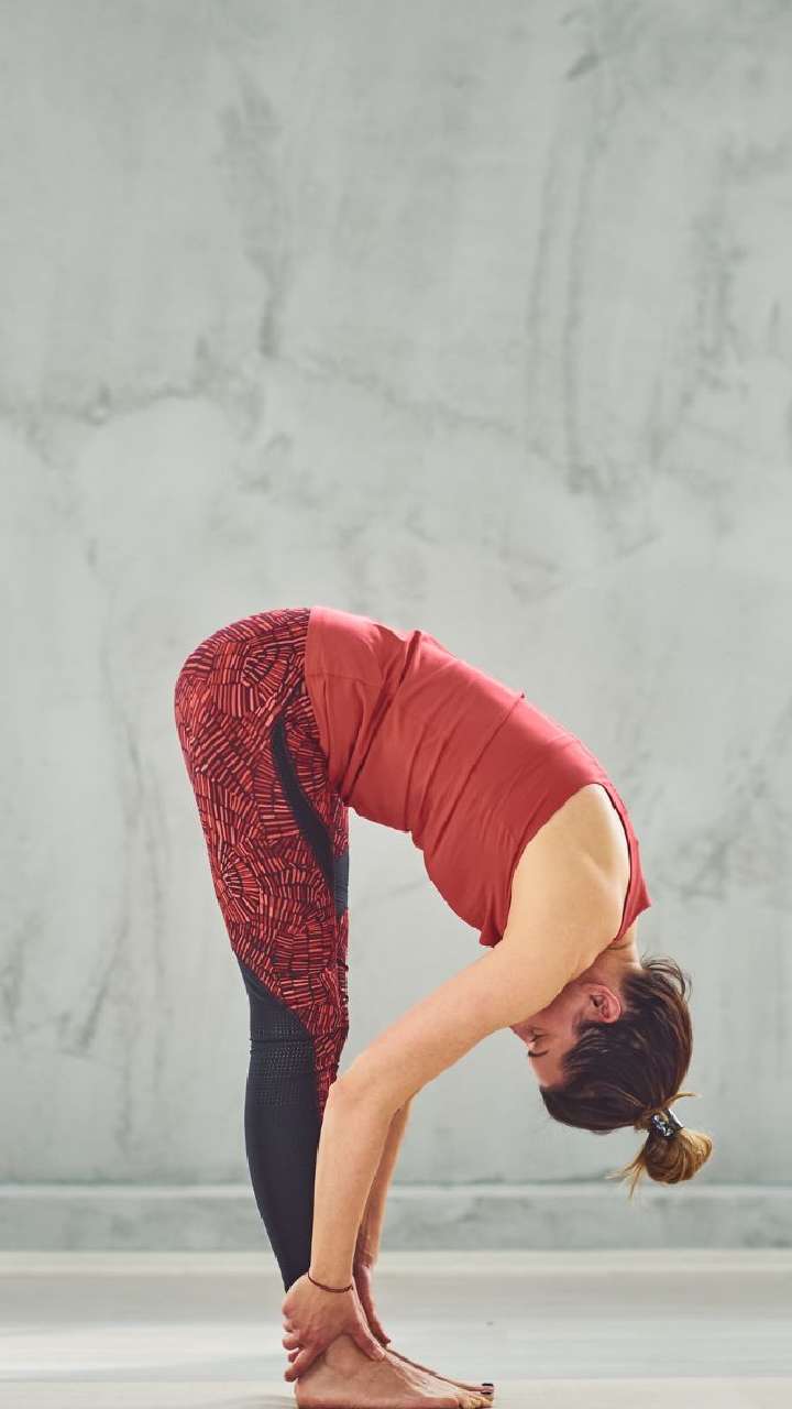 Stand straight with your feet together. Then bend at your waist and tuck in your palms under your feet. Feel the stretch.