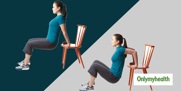 बाहों को मजबूत बनाने के लिए ट्राइसेप्स डिप्स कीजिए। इसे करने के लिए अपने दोनों हाथों को शरीर के पीछे की तरफ बांधते हुए और अपने पैरों को कुर्सी के सामने सीधे थोड़ी दूरी पर रखते हुए कुर्सी के किनारे पर बैठें। पैरों को सीधे रखते हुए, कुर्सी को थोड़ा ऐसे घुमाएं ताकि आप अपने शरीर को अपनी भुजाओं से नियंत्रित कर सकें और धीरे धीरे अपनी कोहनी को 90 डिग्री कोण पर ले जाएं। अब अपनी कोहनियों की मांसपेशी को फैलाते हुए वापस अपना शरीर उठाएं। प्रारंभ में, अपने घुटनों को मोड़ते हुए पैरों को फर्श पर सीधा रखें।