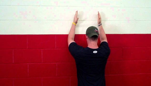 - Innivacally place the elbows on the wall in a way that they are close to each other rich in front of your chest, opened up from the palm area to imitate a V shape.