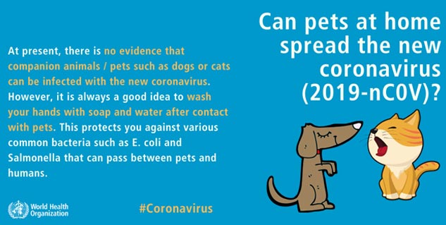 World Health Organization (विश्व स्वास्थ्य संगठन) ने पहले अपने मिथ-बस्टर पेज पर यह लिखा था कि अभी तक कोरोना वायरस के सामान्य या पालतू जानवरों जैसे- कुत्ते, बिल्ली आदि में फैलने के कोई मामले नहीं मिले हैं। अभी भी WHO ने इस पर अपनी कोई राय नहीं जाहिर की है कि जानवरों को नोवल कोरोना वायरस से कितना खतरा है। मगर WHO यह जरूर कहता है कि अपने पालतू जानवरों को छूने, उठाने के बाद आपको अपने हाथों को साबुन और पानी से धोना अच्छी बात है। ये कई अन्य प्रकार के बैक्टीरिया और वायरस से बचा सकता है।