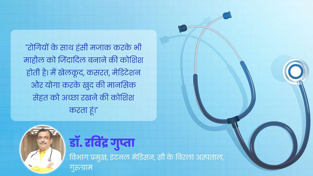 डॉ. रविंद्र कहते हैं, "हम अपने कुछ प्रेशर को अपने जूनियर स्टाफ या नर्सिंग स्टाफ को ट्रांसफर कर देते हैं। इसके अलावा रोगियों के साथ हंसी-मजाक करके भी माहौल को जिंदादिल बनाने की कोशिश करता हूं। मैं खेलकूद, कसरत, मेडिटेशन और योग करके खुद की मानसिक सेहत को अच्छा रखने की कोशिश करता हूं।"