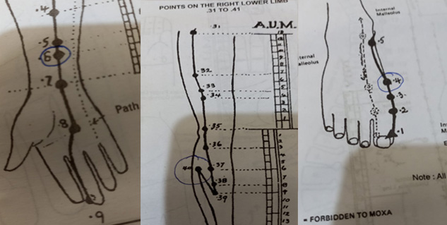 P-6 is three finger widths below the inner wrist and is also known as "neiguan" or "inner pass." P-6, combined with CV12 and ST36, significantly alleviates recurrent hiccups, especially in individuals who had arthroplasty, according to a 2019 study. This is an acupressure point that can help with gas and bloating, as well as carpal tunnel syndrome, migraines, and upset stomach.