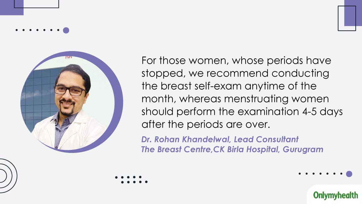 “For those women, whose periods have stopped, we recommend conducting the exam anytime of the month, whereas menstruating women should perform the breast self-examination 4-5 days after the periods are over,” he said. This is because the breasts are the least tender and lumpy during this phase.