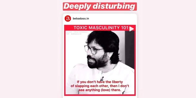 लेकिन अभी हाल में 'कबीर सिंह' फिल्म के डायरेक्टर संदीप रेड्डी वांगा ने अनुपमा चोपड़ा के साथ एक साक्षात्कार में कुछ सवालों के जवाब देते हुए कहा 'जब आप किसी से सच्चा या गहरा प्यार करते हैं या फिर किसी से दिल से जुड़े होते है, तो ऐसे में यदि आपके पास फिजिकल डेमोनस्ट्रेशन की आजादी नहीं है और आप एक दूसरे को थप्पड़ मारने की आजादी नहीं है, तो आपके बीच प्यार नहीं है।