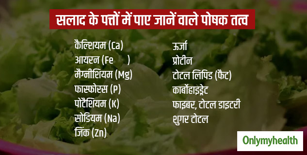 डायट मंत्रा क्लीनिक की डायटीशियन कामिनी कुमारी बताती हैं कि सलाद के पत्तों में प्रोटीन, लिपिड फैट, कार्बोहाइड्रेट, फाइबर, कैल्शियम, आयरन, मैग्नीशियम, फास्फोरस जैसे कई आवश्यक पोषक तत्व और मिनरल्स मौजूद होते हैं, जो हमारे स्वास्थ्य के लिए लाभकारी साबित हो सकते हैं। वजन घटाने के लिए डाइट फॉलो करने वाले लोग सलाद ही पत्तियों का सेवन काफी मात्रा में करते हैं। सलाद की पत्तियों से ना सिर्फ हमारा वजन कम होता है, बल्कि इससे इम्यूनिटी पावर भी मजबूत होता है। पाचन संबंधी परेशानियों के लिए भी यह फायदेमंद है। सलाद की पत्तियों में लगभग सभी तरह के विटामिंस जैसे विटामिन B6, विटामिन B12, विटामिन ए, विटामिन ई, विटामिन डी, विटामिन के जैसे कई अन्य विटामिंस भरपूर रूप से होते हैं। आइए विस्तार से जानते हैं सलाद ही पत्तियों (Lettuce Benefits in Hindi) से सेहत को होने वाले फायदे-