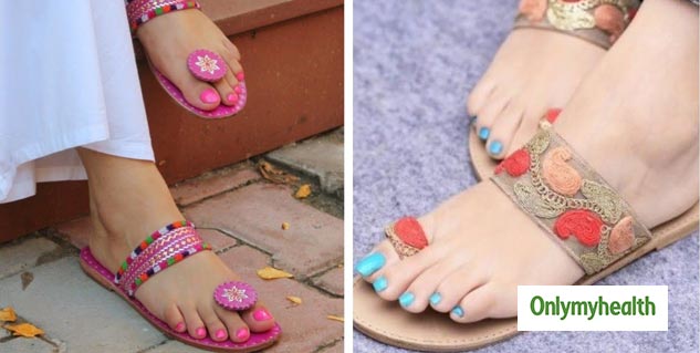 फुटवियर की बात करें तो अलग अलग कपड़ो के साथ आप अलग अलग चप्पलों को ट्राई कर सकते हैं। त्योहारों के इस सीजन में इन दिनों कोल्हापुरी चप्पलें काफी ट्रेंड में हैं। कोल्हापुरी चप्पलें और मोजड़ियां अच्छी लगती ही हैं। महिलाएं हो या पुरुष दोनों ही इसे पहनना पसंद करते हैं। अब इन कोल्हापुरी चप्पलों में काफी कुछ बदलाव भी आ रहा है। पहले जहां यह सिर्फ अपने सपाट तलवे (Flat Sole) के कारण ही जाने जाते थे, अब इसमें हील्स और हल्के फ्लिप-फ्लॉप्स स्टाइल भी आने लगे हैं। इसके अलावा अब यह सिर्फ ब्राउन या चमड़े के वास्तविक रंगों में ही नहीं आते। अब इनकी सिलाई में भी प्रयोग किए जाने वाले धागों के रंगों में भी बदलाव आ गया है। चाहे लहंगा हो, बंगाली साड़ी या बनारसी सिल्क, कोल्हापुरी चप्पल आप किसी भी आउटफिट के साथ ट्राई कर सकते हैं। इसके अलावा आप इसे रोज के कैजुअल्स के साथ भी पहन सकते हैं। ये चप्पलें स्टाइल के अलावा आपके पैरों की सेहत के लिए भी काफी फायदेमंद हैं। आइए जानते हैं इसकी कुछ खास बातें।