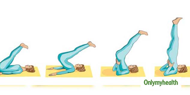 पैर को आपस में मिलाकर और टांगों को सीधा रखकर सांस भरते हुए टांगों को ऊपर की तरफ लाएं और कोहनियों को जमीन पर अच्छी तरह से टिकाने के बाद दोनों हाथों से पीठ को सहारा दें।